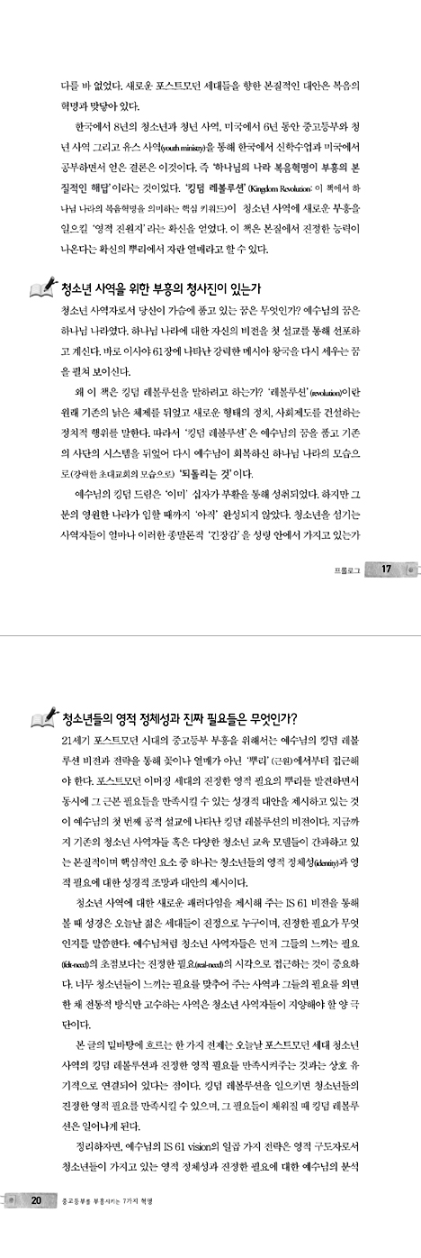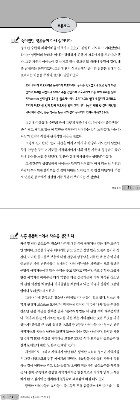 중고등학생들은 예수님에 대해서는 별 관심이 없다. 공부와 학원, 외모에만 신경을 쓴다. 한 시간 예배를 드리기 위해 아이들과 전쟁을 치러야 한다. 중고등부 부흥은 고사하고 어떻게 해야 할지, 어떻게 사역해야 할지 막막하다. 돌파구 마련을 위해 여러 방법들을 시도해보고 발버둥을 쳐본다. “아, 중고등부 사역은 안 되는구나.” 이런 현실에 공감하는 분들이 많을 것이다. … 나는 청소년 사역에 새로운 영적 부흥을 일으킬 진원지를 찾고자 노력해왔다. 과연 청소년 사역의 부흥을 일으키기 위한 본질적인 원리와 전략은 무엇일까? 라는 질문과 십수년을 씨름해왔다. … 한국의 약 90% 이상을 차지하는 교인수 200명 이하 교회들의 중고등부 현실적 문제들에 대한 근본 대안은 무엇인가? 평범한 사역자들과 교사들이 중고등부 부흥 콤플렉스에서 벗어날 수 있는 길은 없는가? 지금은 본질(복음)로 승부할 때 질적으로도 건강하고 양적으로 성장할 수 있다는 것이다. 이것은 한국과 미국에서 14년간 중고등부사역을 통해 얻은 결론이다. 이 책은 중고등부를 실질적으로 부흥시키는 성경의 원리와 실천전략을 제시하고 있다. - 본문 중에서