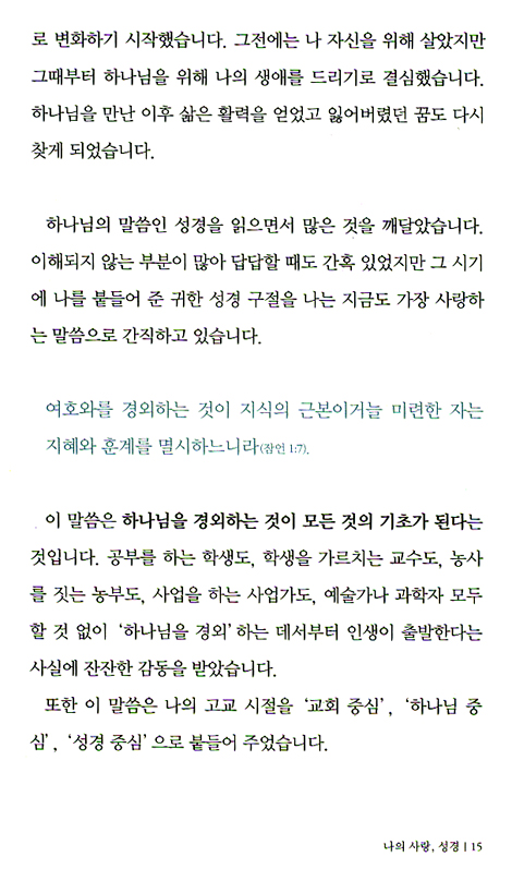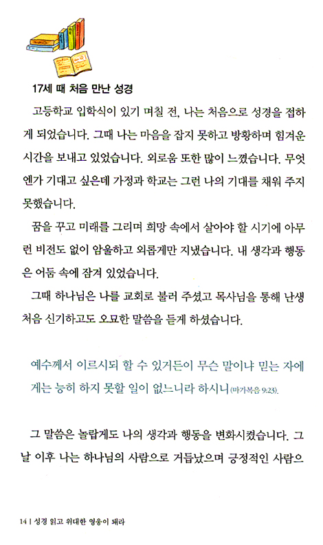 성경을 사랑하고 말로 강조하기보다는 왜 성경을 읽어야 되고 사랑해야 되는지, 그리고 좀 더 구체적으로, 하나님께서 성경을 가까이하는 사람에게 주시는 복이 무엇이며, 성경을 사랑하는 사람들의 생애를 어떻게 인도하셨는지 한눈에 알 수 있도록 쉽게 보여 주는 일이 더 중요합니다.