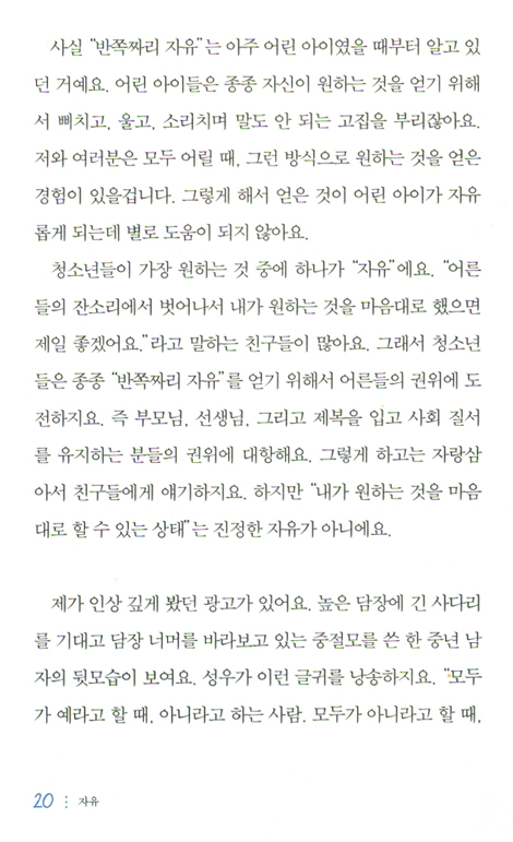 청소년들은 “내가 원하는 것을 마음대로 할 수 있는 상태”를 자유라고 생각하는 경향이 있습니다.
