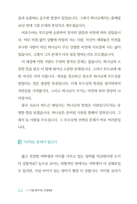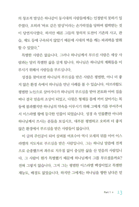 특별한 사람은 없습니다. 그러나 하나님께서 부르신 사람은 세상 사람과는 달리 특별한 삶을 살게 됩니다. 하나님은 하나님의 계획들을 이루시기 위해서 사람들을 부르십니다. 성경을 찾아보면 하나님의 부르심을 받은 사람은 평범한, 아니 더 좋지 않은 환경 속에서 하나님을 만난 사례를 볼 수 있습니다. 아브라함도 평범한 노인으로 살아가다가 하나님의 부르심을 받아 본토와 아비 집을 떠나 결국 믿음의 조상이 되었고, 다윗은 형제들 틈에 끼어 살아가는 목동에 불과했지만 하나님의 약속을 이루시기 위해 그에게 기름 부어주셔서 이스라엘 왕에 등극한 인물이 되었습니다. 성경 속 인물뿐만 아니라 하나님께서 쓰시는 분들을 보십시오. 대부분 평범하고 오히려 더 좋지 않은 환경에서 부르심을 받은 사람들이 많습니다.