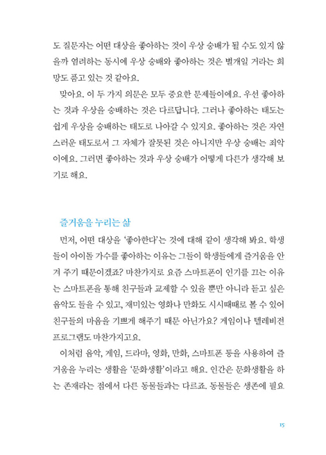 먼저, 어떤 대상을 ‘좋아한다’는 것에 대해 같이 생각해 봐요. 학생들이아이돌 가수를 좋아하는 이유는 그들이 학생들에게 즐거움을 안겨 주기 때문이겠죠? 마찬가지로 요즘 스마트폰이 인기를 끄는 이유는스마트폰을 통해 친구들과 교제할 수 있을 뿐만 아니라 듣고 싶은음악도 들을 수 있고, 재미있는 영화나 만화도 시시때때로 볼 수 있어친구들의 마음을 기쁘게 해주기 때문 아닌가요? 게임이나 텔레비전프로그램도 마찬가지고요.