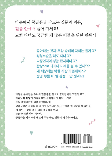다양한 문제들을 믿음생활 안으로 끌어들여서 고민해 보고 하나님이 어떻게 생각하실까에 대하여 알아보는 것은 무척 흥미진진한 믿음 여행이다.믿음생활은 우리의 삶 속에서 일어나는 모든 문제와 다 관련되어 있다. 이 책이 신앙의 폭을 넓혀 풍부하게 하고, 튼튼한 터전 위에 세우며, 궁금증을 시원하게 해결해 주는 좋은 선물이 되기를 반다. 또한 이 책에는 청소년 친구들의 한 줄 생각이 있어서, 또래 친구들이 문제를 어떻게 생각하는지 엿볼 수 있다.
