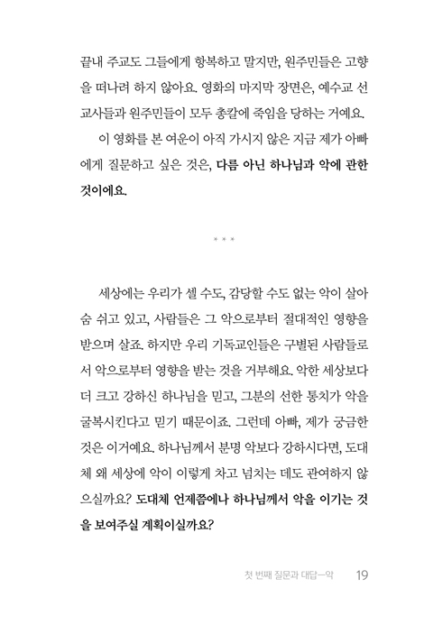이에 대해 아빠는 정답을 단정적으로 제시하기보다, 성경과 신학, 삶의 경험을 바탕으로 함께 생각하고 이해하도록 이끄는 대답을 건넨다. 설교나 훈계가 아니라, 편지에 대한 차분하고 진솔한 답장이다.