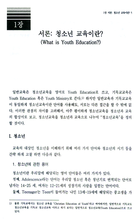 일반교육은 청소년교육을 영어로 Youth Education로 쓰고, 기독교교육은 Youth Education 혹은 Youth Ministry로 쓴다. 하지만 일반교육과 기독교교육이 동일하게 청소년교육이란 단어를 사용해도, 서로는 다른 접근을 할 수 밖에 없다. 이러한 관점의 차이를 고려해서, 아주 평이하게 청소년교육을 청소년과 교육의 합성어로 보고, 청소년교육을 청소년과 교육으로 나누어 “청소년교육”을 정의할 것이다.