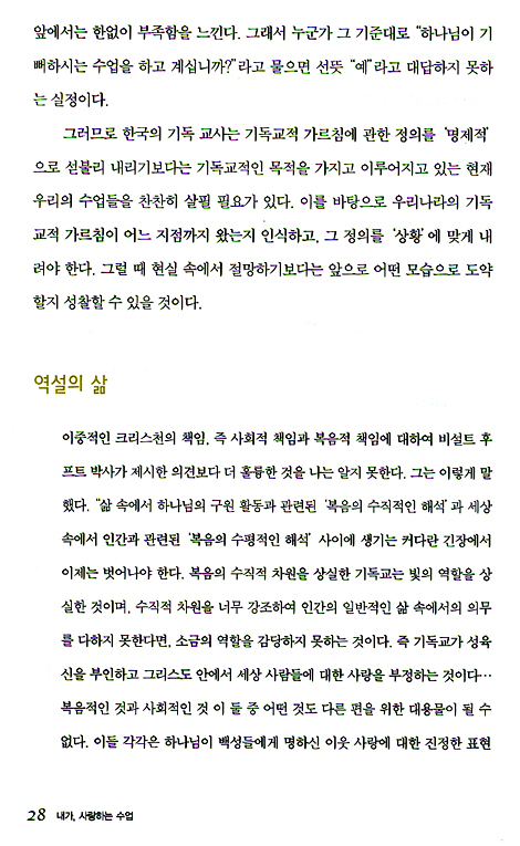 대한민국의 공교육은 수월성 추구 분위기에 압박당하고 기독교적 수업이 끼어들 여지가 거의 없어 보이는 각박한 현장이다. 그럼에도 저자는 젖과 꿀이 흐르는 땅을 향해 광야로 나아간 모세처럼 전인미답의 광야에 길을 내고 있다.
