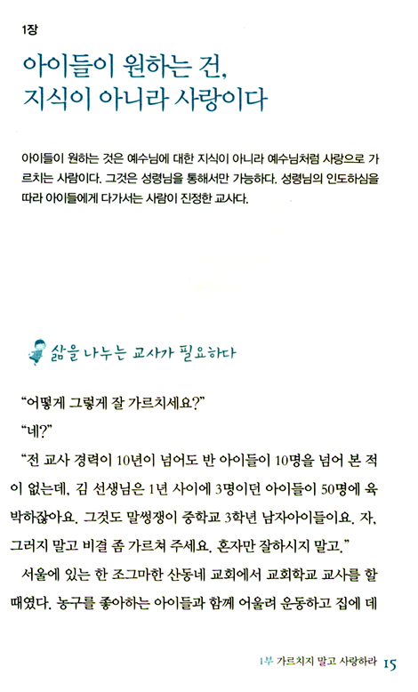 삶을 나누는 교사가 필요하다 / 가르치기 전에 복음을 전하라 / 관심이 없으면 가르침이 아니다