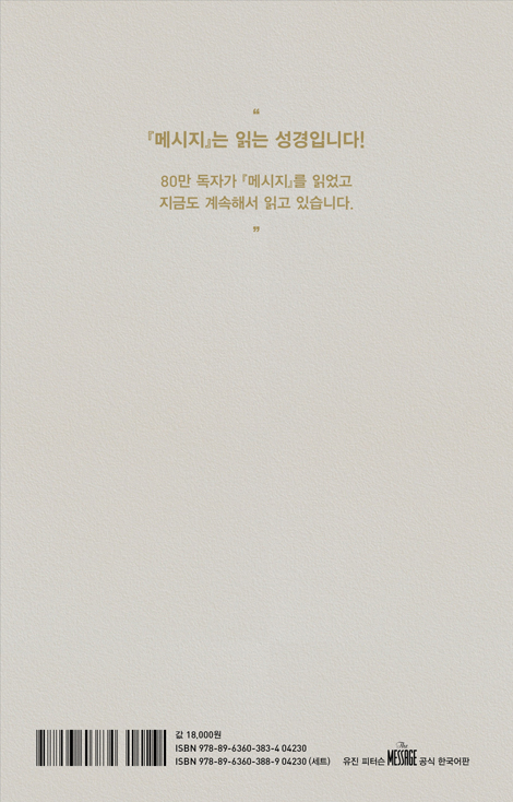 『메시지』는 변함없는 진리의 말씀을, 지금 이 시대의 평범하고 일상적인 단어들에 담아 생동감 있게 전해 줍니다. 성경의 원문에 충실한 바른 번역이 살아 있는 언어로 더욱 빛을 발하는 『메시지』는, 성경을 처음 읽는 사람이든 오랫동안 상고해 온 사람이든, 누구에게나 깊이 파고드는 생명력 있는 진리의 귀한 통로가 될 것입니다. 이 시대의 젊은이와 미래를 이끌어 갈 다음 세대에게 생명을 살리는 도구로 크게 쓰일 것입니다.