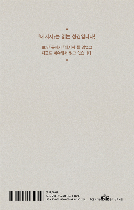 『메시지』는 변함없는 진리의 말씀을, 지금 이 시대의 평범하고 일상적인 단어들에 담아 생동감 있게 전해 줍니다. 성경의 원문에 충실한 바른 번역이 살아 있는 언어로 더욱 빛을 발하는 『메시지』는, 성경을 처음 읽는 사람이든 오랫동안 상고해 온 사람이든, 누구에게나 깊이 파고드는 생명력 있는 진리의 귀한 통로가 될 것입니다. 이 시대의 젊은이와 미래를 이끌어 갈 다음 세대에게 생명을 살리는 도구로 크게 쓰일 것입니다.
