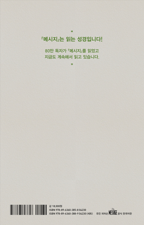 『메시지』는 변함없는 진리의 말씀을, 지금 이 시대의 평범하고 일상적인 단어들에 담아 생동감 있게 전해 줍니다. 성경의 원문에 충실한 바른 번역이 살아 있는 언어로 더욱 빛을 발하는 『메시지』는, 성경을 처음 읽는 사람이든 오랫동안 상고해 온 사람이든, 누구에게나 깊이 파고드는 생명력 있는 진리의 귀한 통로가 될 것입니다. 이 시대의 젊은이와 미래를 이끌어 갈 다음 세대에게 생명을 살리는 도구로 크게 쓰일 것입니다.