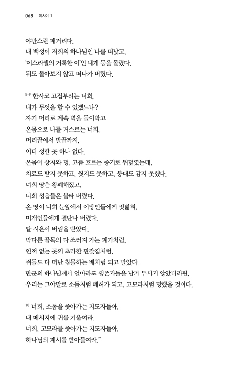 번역(飜譯)은 반역(反逆)이다. 게다가 중역(重譯)이라니! 대역죄에 처해야 마땅하다. 이 책은 유진 피터슨을 빙자해 성경 원문을 현대 한국 일상어로 읽어 내려는 발칙한 음모의 소산이다. 꽤 잘나가는 전문번역자들과 믿었던 성서학자들이 이 소란에 줄줄이 동원된 듯하다. 신속 과감하게 이 작전을 배후에서 조종한 출판사의 배포에 움찔했다. 『메시지』에 부화뇌동할 젊은 세대들과 초신자들이 적지 않을 것 같아 벌써부터 걱정이다. 이런 예사롭지 않은 설레임, 대체 얼마 만인가?