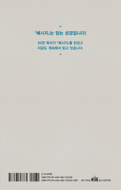 『메시지』는 변함없는 진리의 말씀을, 지금 이 시대의 평범하고 일상적인 단어들에 담아 생동감 있게 전해 줍니다. 성경의 원문에 충실한 바른 번역이 살아 있는 언어로 더욱 빛을 발하는 『메시지』는, 성경을 처음 읽는 사람이든 오랫동안 상고해 온 사람이든, 누구에게나 깊이 파고드는 생명력 있는 진리의 귀한 통로가 될 것입니다. 이 시대의 젊은이와 미래를 이끌어 갈 다음 세대에게 생명을 살리는 도구로 크게 쓰일 것입니다.