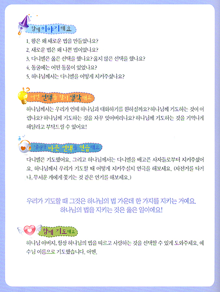 · 이야기를 읽고 나면 다음과 같은 다양한 질문과 활동들이 제시되어 배운 교훈들을 강화시켜 줄 것입니다.