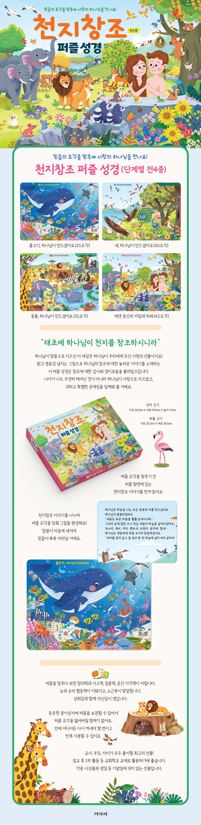 밝고 생동감 넘치는 그림으로 하나님의 창조에 대한 놀라운 이야기를 소개하는 이 퍼즐 성경은 창조에 대한 감사와 경이로움을 불러일으킵니다.